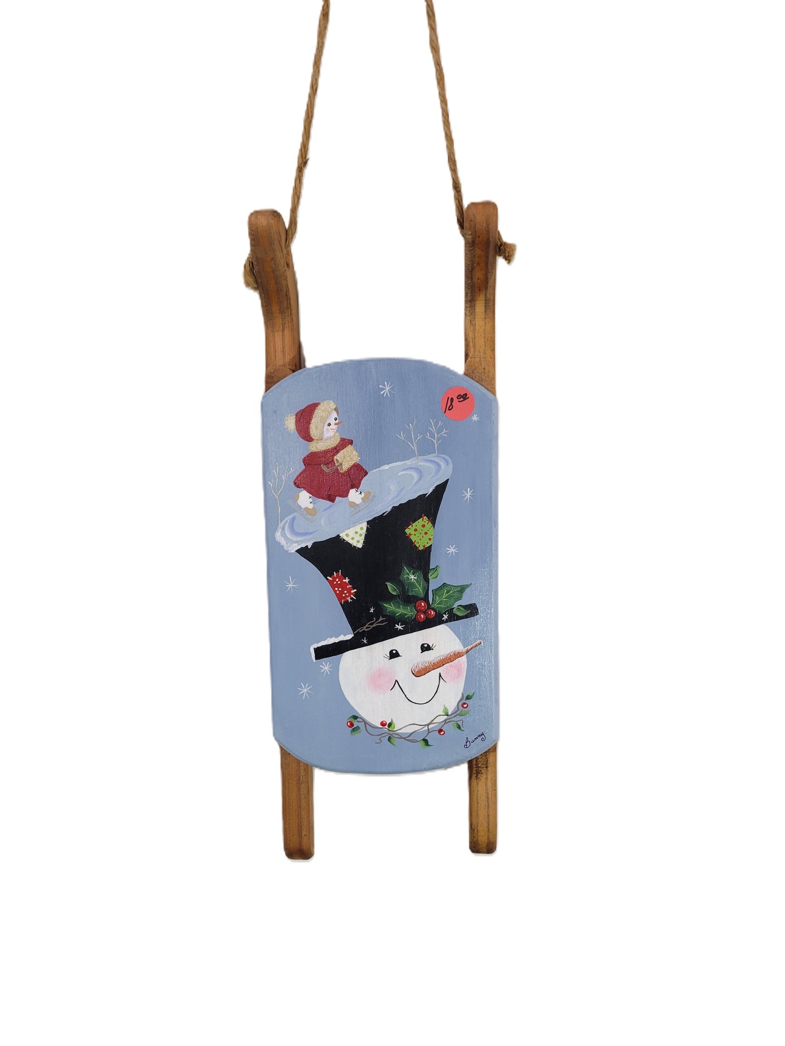 Discover a one-of-a-kind holiday treasure crafted by local artist Bunny. This hand-painted wooden sled features a charming snowman sporting a classic top hat, crowned with a delightful ice-skating snowgirl. Each brushstroke brings warmth and whimsy to your seasonal décor, making it the perfect conversation starter for your home or a meaningful gift for collectors who appreciate artisan craftsmanship. Signed by the artist, this festive piece captures the magic of winter in a way mass-produced decorations simply cannot match.