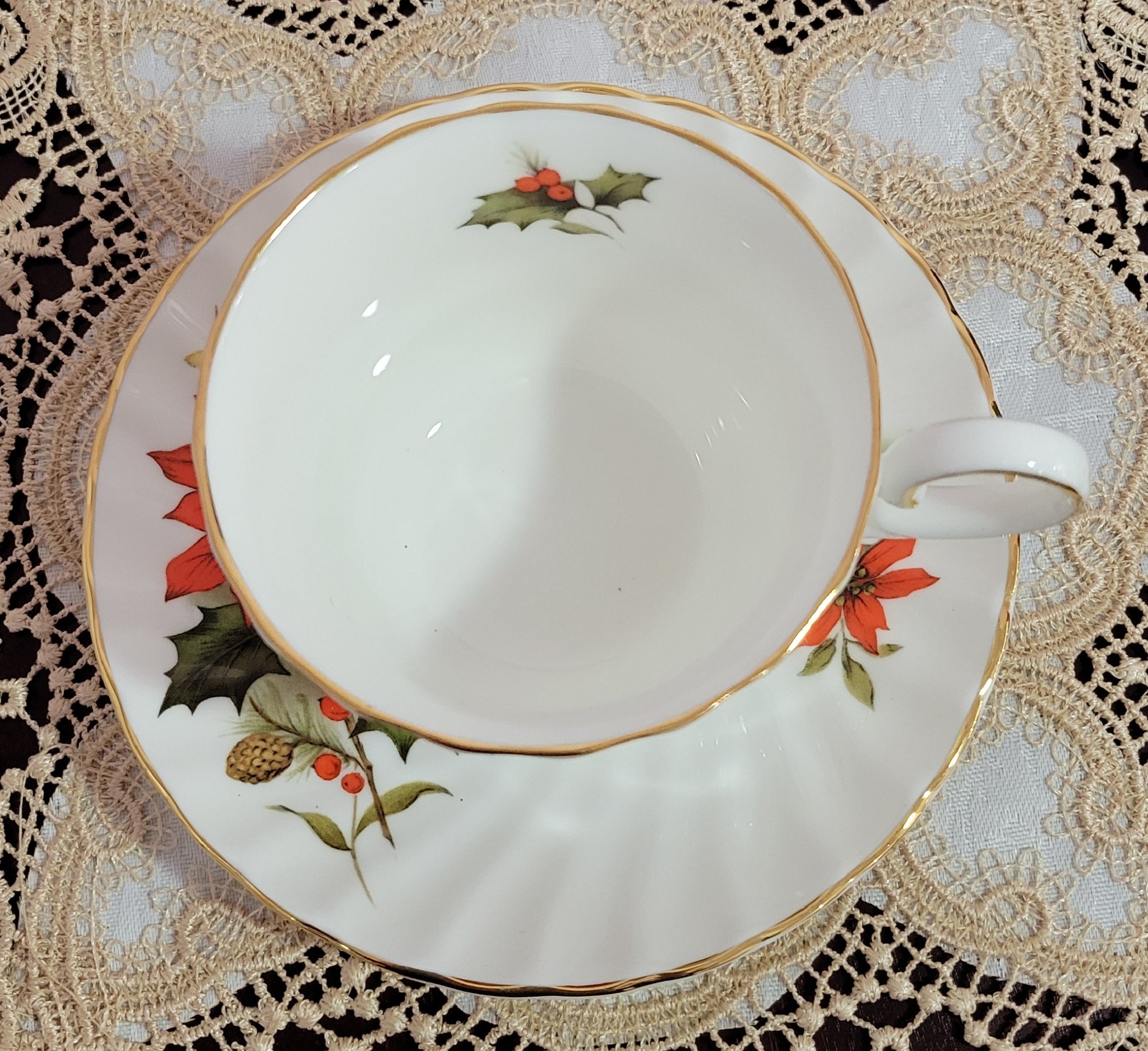 Experience holiday elegance with the Poinsettia & Pine English Bone China Teacup set. Featuring exquisite red poinsettias, crisp white Christmas roses, holly with berries, and detailed pine cones, each teacup and saucer is trimmed in rich gold for a festive finish. This set of two teacups and saucers brings timeless charm to your Christmas gatherings, making every sip feel special.