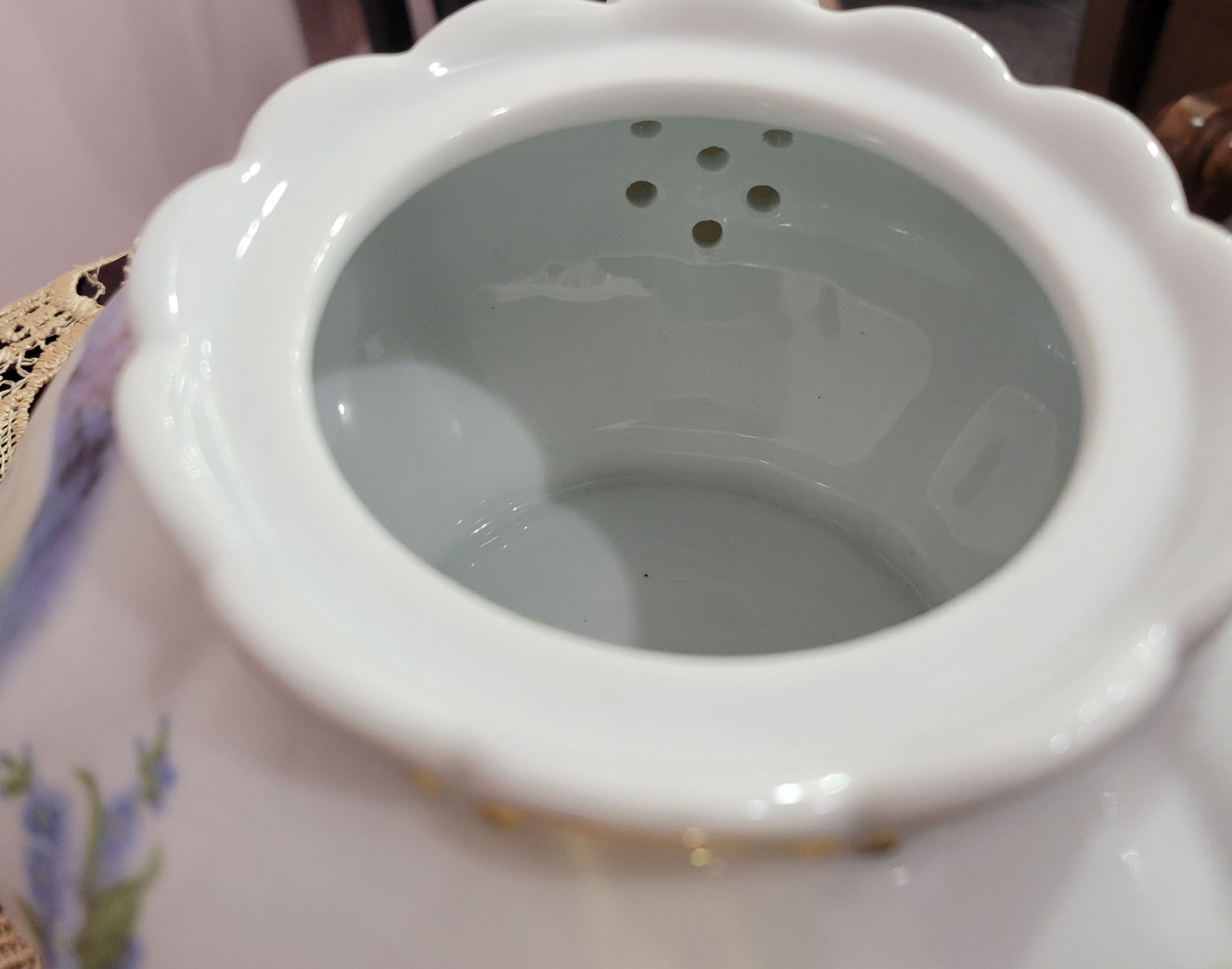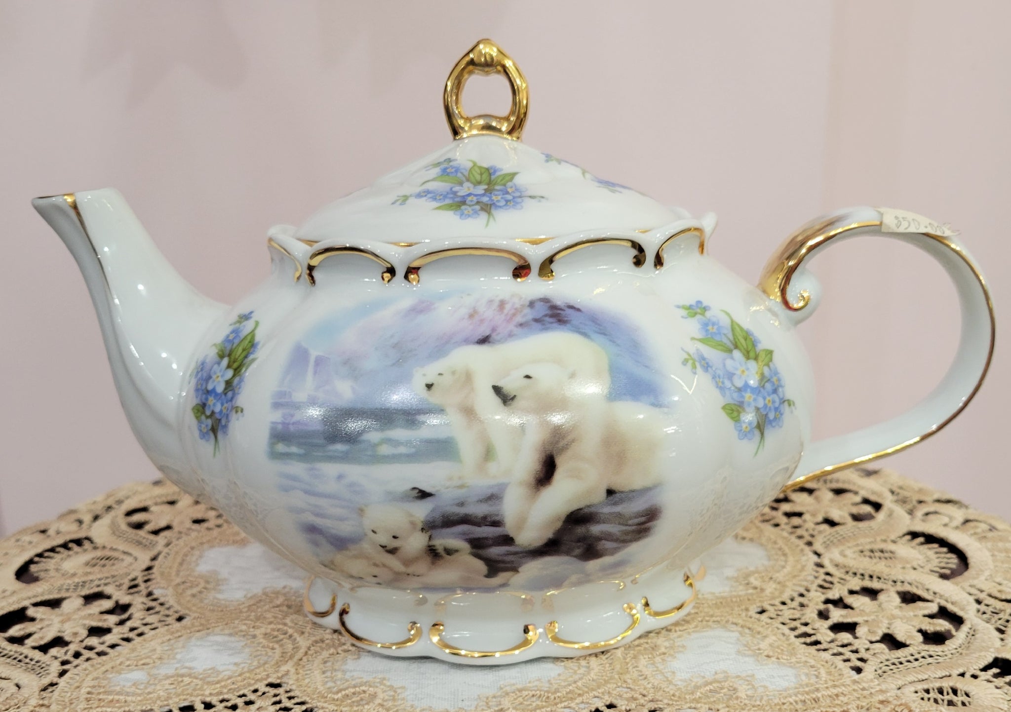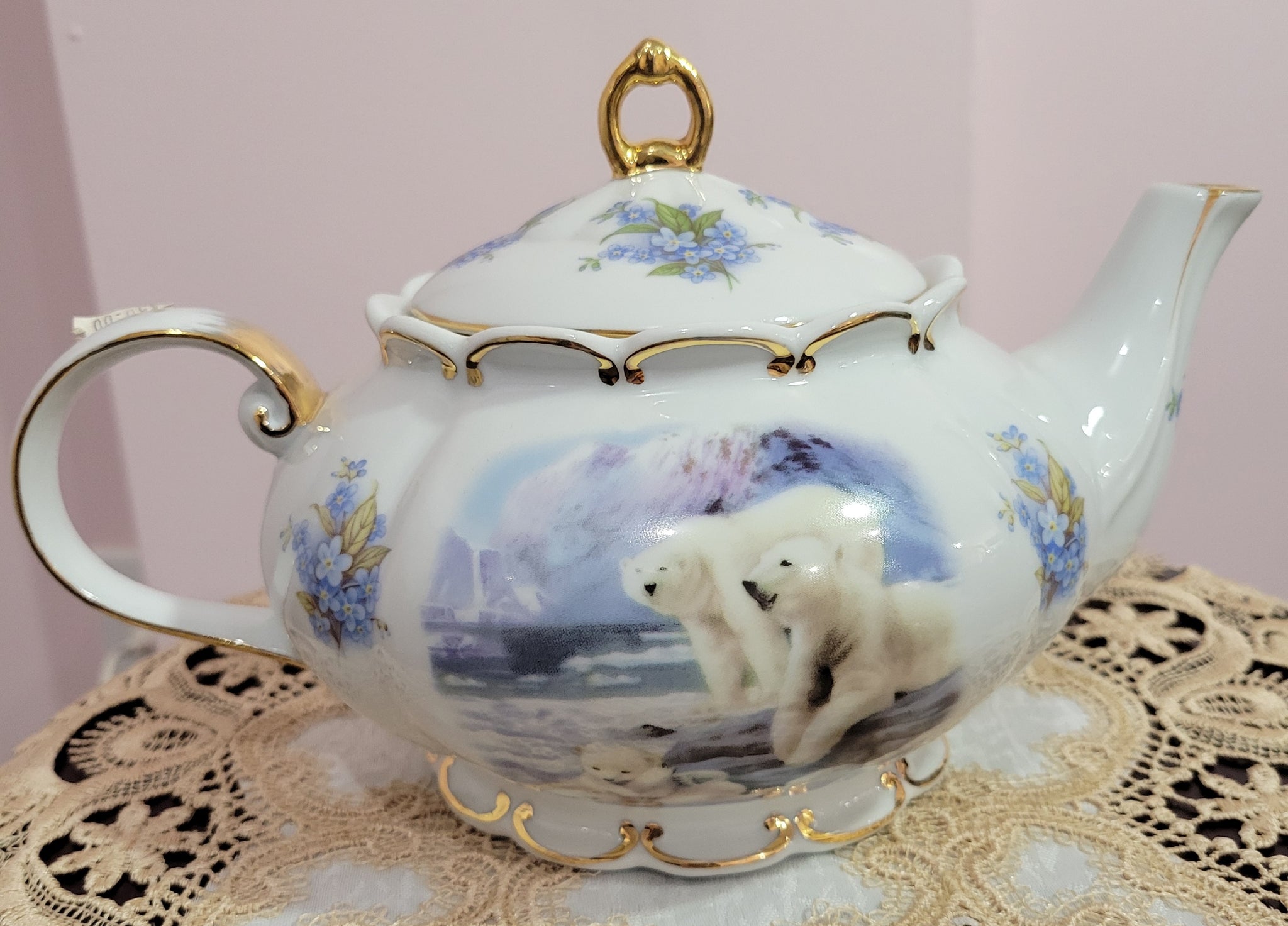 Experience elegance with this Polar Bear Princess Teapot crafted from fine porcelain and delicately trimmed in gold. Featuring charming polar bears and soft blue forget-me-nots, its 6-cup size combines beauty with practicality. Hand-decorated in the United States, this teapot is ideal for collectors or anyone who appreciates a refined tea experience. To preserve its exquisite finish, hand washing is recommended. Add a touch of sophistication to your tea time with this stunning, carefully crafted piece.