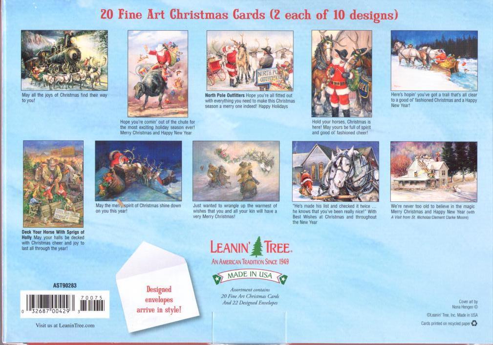 Celebrate the holiday season with the Santa's Western Route Christmas Card Assortment by Nona Hengen. Featuring 20 stunning cards—two each of 10 exclusive designs—paired with 22 coordinating envelopes, this elegant set lets you share warm "Merry Christmas" and "Happy Holidays" wishes in style. Printed on sustainably sourced paper with eco-friendly soy-based inks, these cards blend artistic beauty with responsible care. Proudly crafted in the U.S.A. by Leanin' Tree, this assortment delivers timeless charm and thoughtful quality, making your holiday greetings truly special.