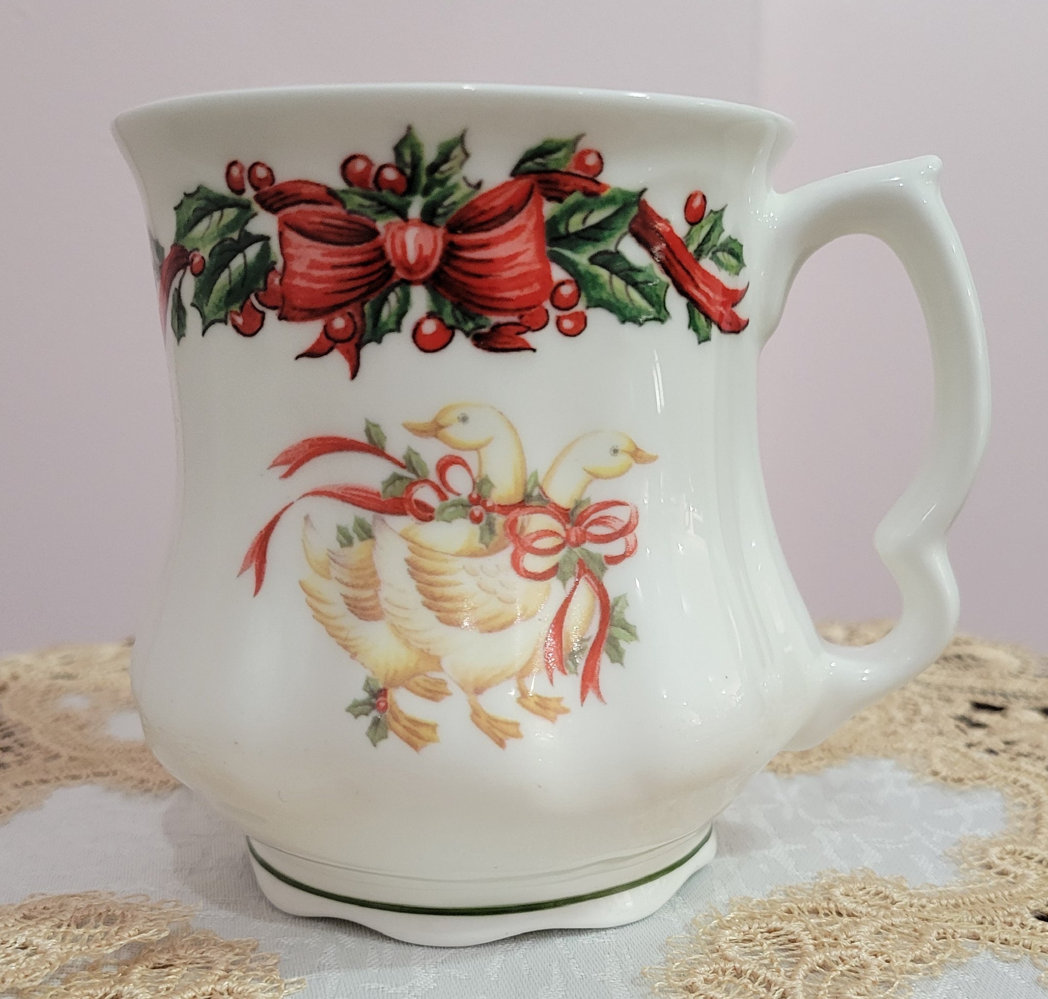 Enjoy the charm of Victorian-era geese beautifully illustrated on this English Bone China mug. Crafted in Stoke-on-Trent for Berta Hedstrom, each mug brings timeless elegance and festive spirit to your tea or coffee moments. Perfect for holiday gatherings or as a thoughtful gift, this mug combines classic artistry with lasting quality. Elevate your collection with a piece that captures tradition and warmth.